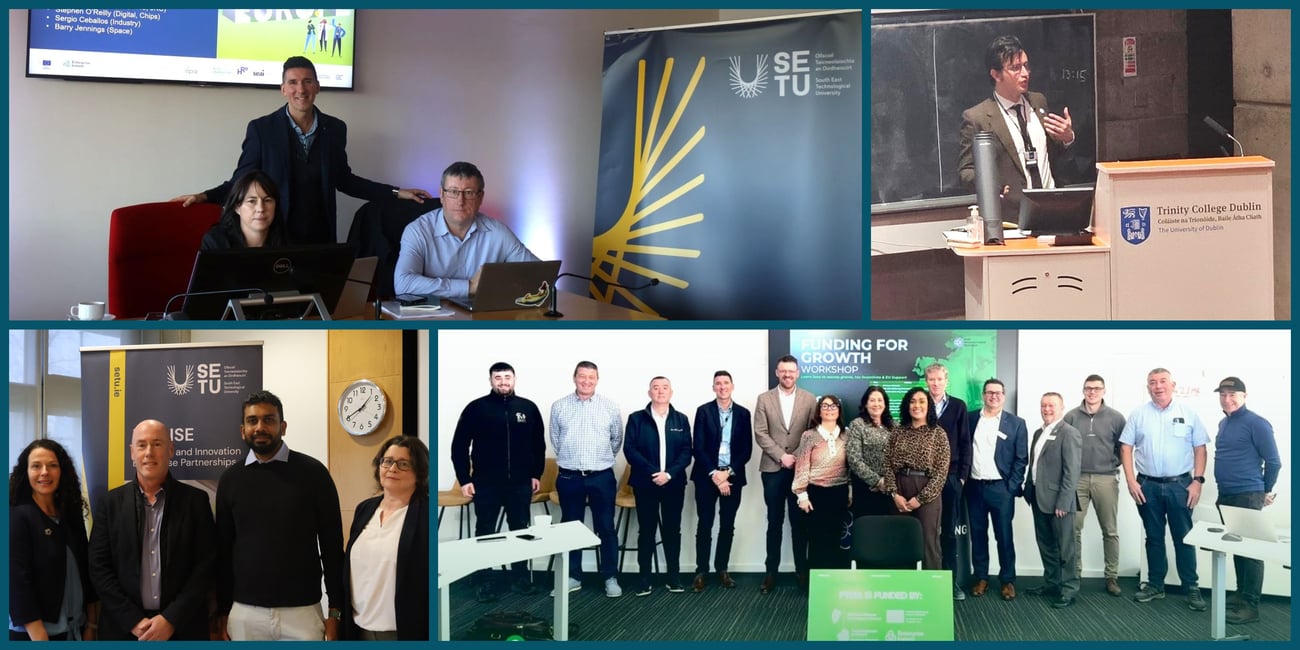 Out and about Top Left, L-R: Digital, Industry & Space NCPs, Claire Whelan, Sergio Fernandez-Ceballos and Stephen O'Reilly visiting SETU Top Right: Culture, Creativity & Inclusive Society NCP Patrick Lansley speaking at the Development Studies Association of Ireland Bottom Left, L-R: Geraldine Canny, SETU, NCP Mark Sweeney, Enterprise Ireland, Abhishek Babu, SETU, National Delegate Helen Murphy, Department of Agriculture, Food and the Marine at a Cluster 6 meeting in SETU Waterford Bottom Right: Ann Dooley, EEN Ireland and Cluster 4 National Delegate Sergio Fernandez-Ceballos at IMR Mullingar for a PTMA - Irish Precision Tooling & Machining Association of Ireland ‘focused on funding’ event for members
